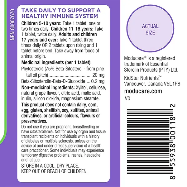 Moducare is a unique combination of plant sterols and sterolins in a clinically-researched 100:1 ratio. Moducare chewable tablet is flavoured with natural grape and sweetened with xylitol.